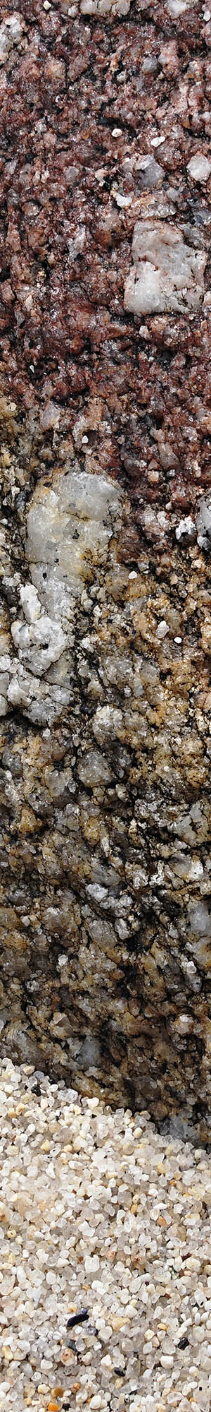 Another close-up with a coarse surface bedrock granodiorite boulder embedded in the coarse sands. Note the yellow and red sections of the rock that reflects the amount of surface iron minerals seawater has rusted out. Grains of chemically rusted out minerals don't last long leaving more of the white silicaseous sand. The Asilomar State Beach headlands along the west shores of Pacific Grove afford excellent setting sun views across rocky outcrop islets on uncommon days with little low fog overcast and rather high cirrus clouds. Neither of the two days I was there offered much at sunset so at mid afternoon drove home.