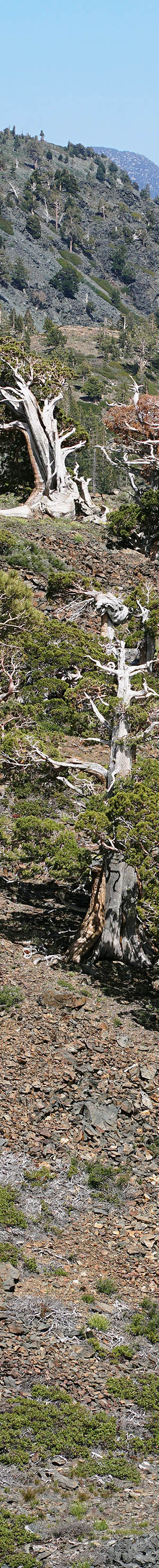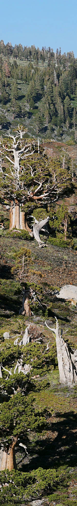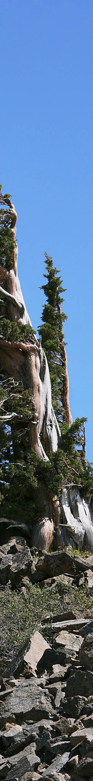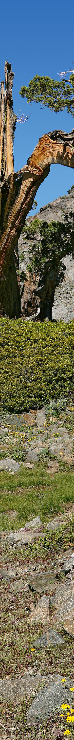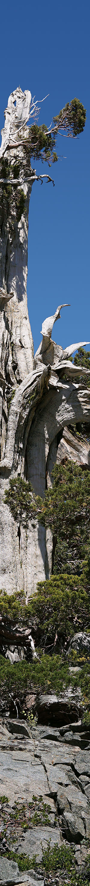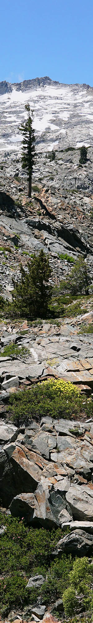 Worked about 12 noon, the above wind pruned flagged mountain juniper shows the narrow windward view. Other tree species with a flagged form use a similar strategy of hiding their live cambium branches behind older now dead weather beaten trunks of the younger tree. A reason this zone has so many spectacular juniper, few of which can be seen from the PCT, is because of high winds from the west and northwest funneling through the gaps of Mosquito Pass then Heather Lake. Note below in front the glacially smoothed dark metamorphic rock with pinemat manzanita growing in soils of the protected cracked rock in front. And off to the left in back is another severely wind tortured juniper.