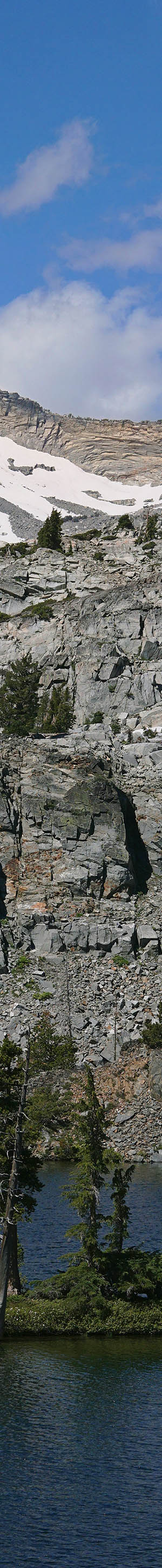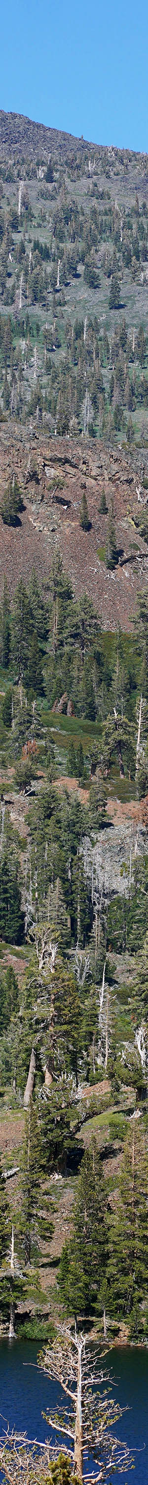 Instead of setting up camp, I dropped gear then hiked west on the PCT to the east end of Heather Lake for a photo about 10:45am PDT. The ridge behind the deep cold water lake is about a half mile distant while the snowy granitic Crystal Range is another 1.5 miles with large Lake Aloha unseen between the two. 9983 foot Pyramid Peak at frame left and 9975 foot Mt. Price right. The lake was rather breezy as I worked the above 5 column stitch blended panorama, a huge 14000 by 5800 pixel image that later after post processing I was impressed by how well it turned out with superb detail. My 56mm, 30mm, and new 85mm prime lenses are exceptionally sharp optics one can understand via the enlarged vertical slice view. At that distance, the snowy areas though in slightly offset front lit sunlight are far enough distant that due to atmospheric dimming, are not overly harsh for the camera sensor's dynamic range. Every bit as sharp using best apertures of F4.5 to F5.6, as what one can expect with the best full frame camera system, though requires more stitched frames to do so. Stitch blending breezy wavy lake waters requires taking a set of additional quick same exposure level, same manual focus, shots of each frame in order for Autopano Kolor stitching software to be able to blend together frames without the result looking unnatural. And likewise because clouds were continually moving, also took a like quick set manually focused on infinity. Doing so, it is impossible to move my tripod panoramic head with detents back to the exact position of earlier frames, however being careful make that workable.