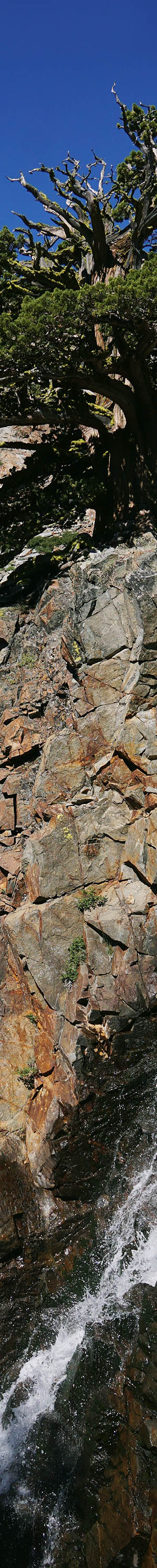 This next cascade and mountain juniper image above, not far from my camp spot, was shot at 10am. Unseen below the cascade is a dark pool that is in shade most hours of the day. In the full image on the misty sides of the falls within rusty metamorphic geology rock, I could see red Indian paintbrush and crimson columbine. Note the few bright white fallen juniper branches on ledges and bushes below the gnarly old tree, some of which may be over a millennium in age. My Sigma 19mm F2.8 relatively is not a sharp prime lens so I usually downsize full image sizes from the default 6000x4000 to 5400x3600 pixels.