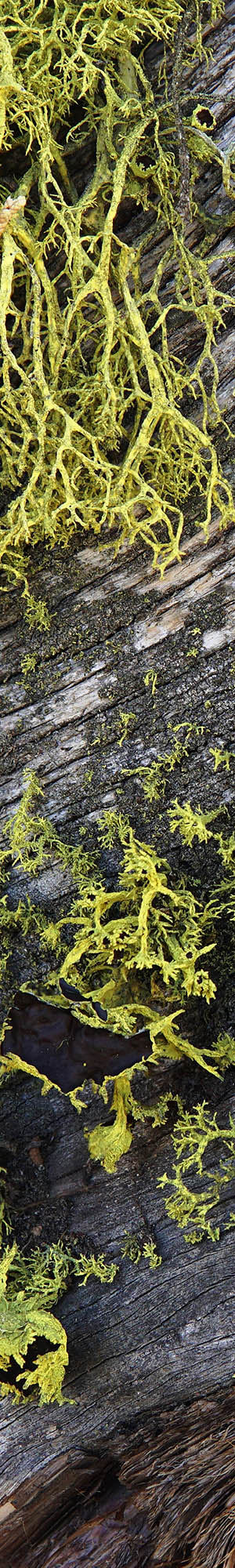 This close-up of a mountain juniper branch is covered the bizarre forms of bright frog yellow green wolf lichen, letharia vulpina.