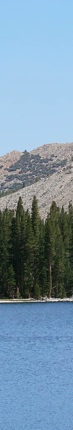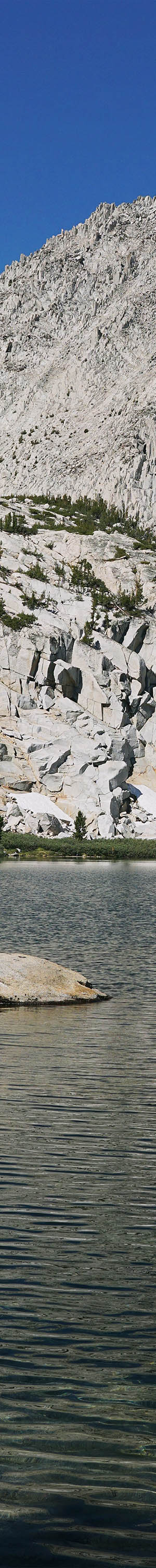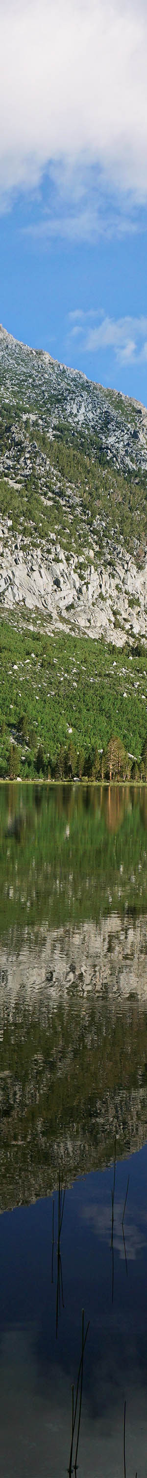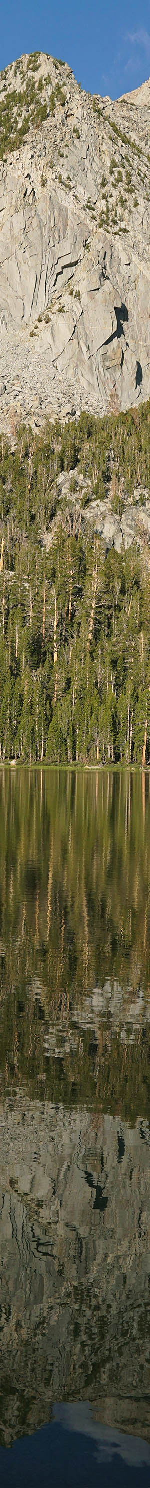 15 minutes later further along the shore, worked this 3 column stitch blend towards the northwest. Most of the trees at the lake shores are lodgepole pines while the lighter green trees mid right are quaking aspen. The big peak above is 13000 foot Mt Morgan, a good 3000 feet above the lake. The reason for the stunted aspen are in that corner of the lake is due to snow avalanches pruning away any taller trees down that towering slope. Where the taller lodgepoles start beyond the those aspen is not next to them but rather at the end of a peninsula with a large bay on the other side where we were camped that reaches almost to where that cascade drops.