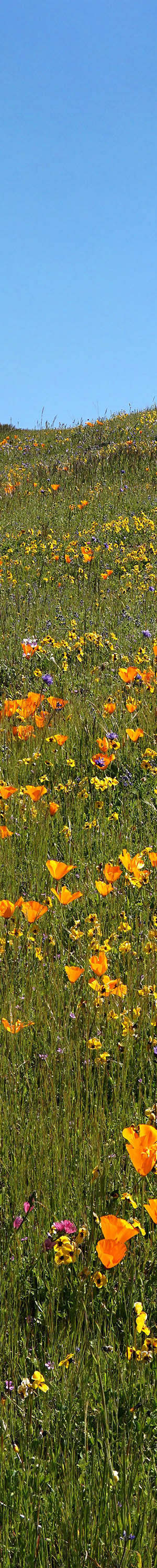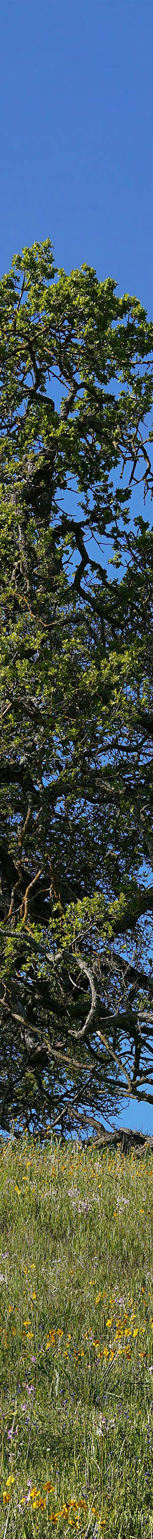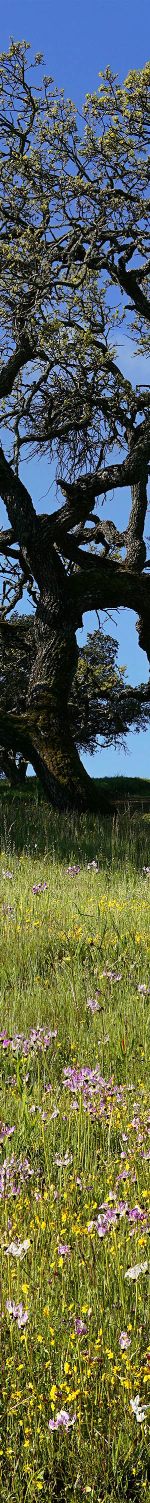 This was shot near the above TX02395-02456-3x1v image and is the best area with California poppy I've found in the Pacheco Pass area. At the hilltop are coast live oak. Wildflowers include the pink hued checker mallow, sidalcea malviflora, California violet, Mt Diablo shooting stars, blue dicks, popcorn flower, bicolor lupine, fiddleneck, filaree.