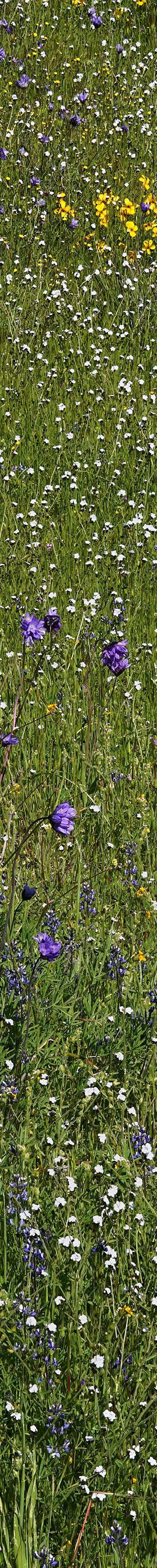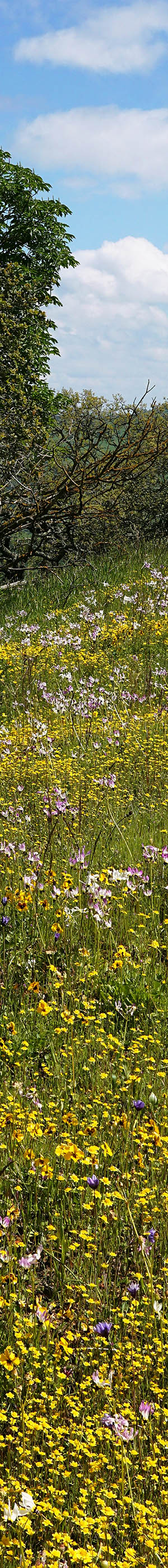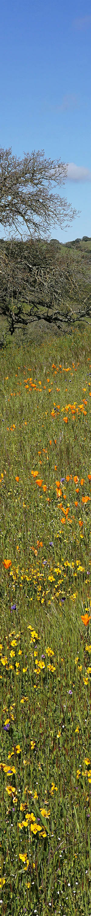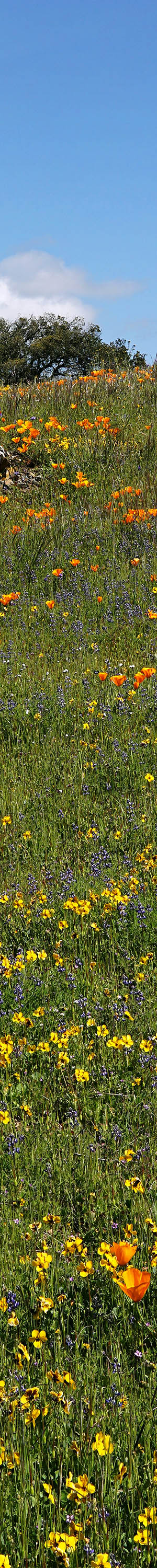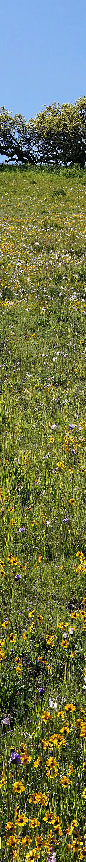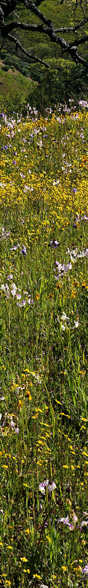 This area with some of the best dense wildflowers in the refuge, is just beyond the parking lot off to the right up the hill of the loop trail. In this view are coast live oak, California poppy, California violet, Mt Diablo shooting stars, blue dicks, popcorn flower, bicolor lupine, fiddleneck, filaree. Although the small bicolor lupine are dense, the downsized image so blends them with green vegetation that they are barely visible. In the enlarged vertical slice view, at 50% pixels, the lupine are easily visible.