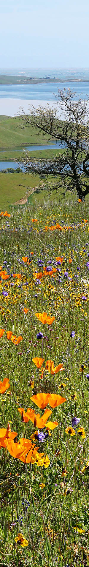 At page top was my last subject this day, and the strongest. An excellent foreground of California poppy, eschscholtzia californica, California violet, Mt Diablo shooting stars, blue dicks, dichelostemma capitatum, popcorn flower, bicolor lupine, tomcat clover, trifolium willdenovii, fiddleneck, filaree, with huge San Luis Reservoir filled to capacity surrounded by lushly green blue oak savanna grassland and the San Joaquin Valley north of Los Banos is in the hazy distance. California poppies are rather limited, spotty, about this pass zone, so this subject was exceptional. I only attempted a single frame because breezes were increasing at the time so was barely able to get in enough focus stack shots. Most water in vast San Luis Reservoir is pumped uphill from O'Neill Forebay that is fed from the California Acqueduct. During evenings, water can be released generating electrical power.