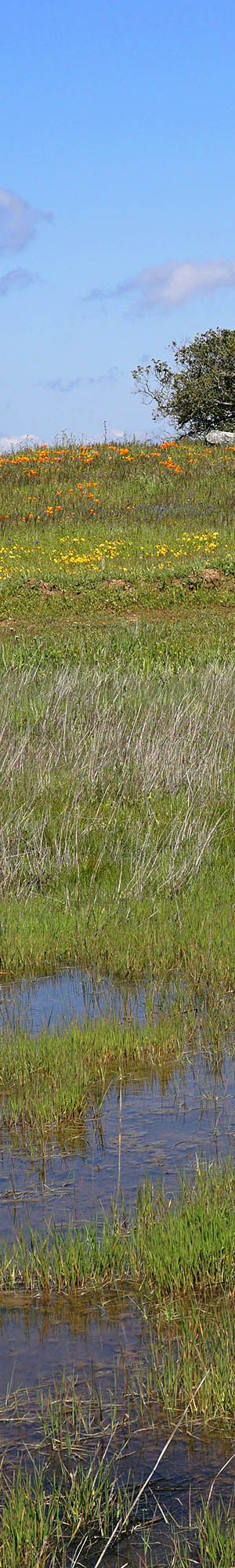 A small ephemeral marshy area with algae reflecting blue skies with coast live oak, quercus agrifolia, California poppy, California violets, Mt Diablo shooting stars, blue dicks, bicolor lupine, butter and eggs, lomatium.