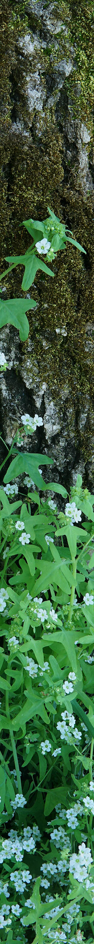 An intimate landscape of white fiesta flower, pholistoma membranaceum, growing beside a mossy blue oak trunk. This shade loving densely tangling species is common beneath both blue and coast live oaks.