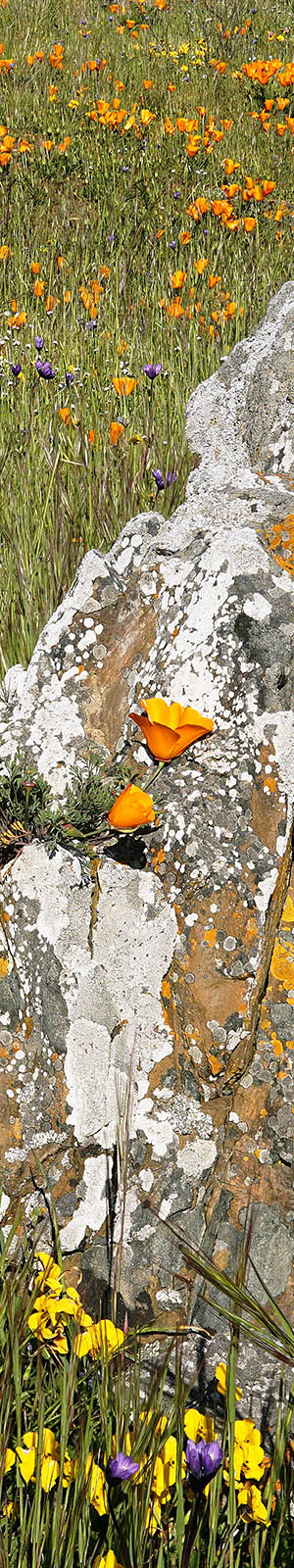An aesthetic Coastal Range marine sandstone neogene geology lichen covered outcrop with California poppy, California violet, popcorn flower, blue dicks, bicolor lupine, filaree.