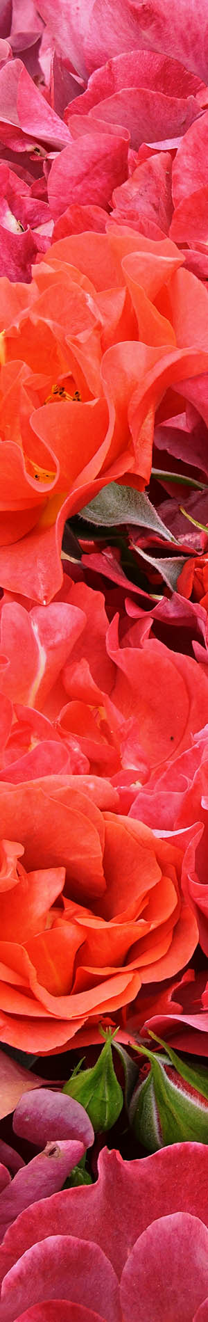 Coral, salmon-orange blending, peach blending, ages to darker. Mild, fruity fragrance. 30 petals. Average diameter 5 ft. Very large, full (26-40 petals), cluster-flowered, in small clusters, spiral centers bloom form. Blooms in flushes throughout the season. Pointed buds. Medium, upright. Medium, glossy, dark green foliage. Height of 4'.
