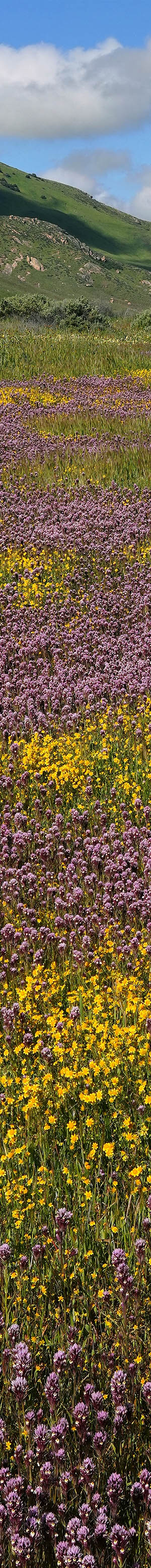 At 10:12am, I returned to this expanse of California goldfields, purple owl's clover, I'd passed by earlier then worked the above subject that also included a fine set of clouds. Note the whitish patch of tidy tips frame upper mid left. The breeze had become impossible, so then returned to my vehicle. Clouds to the east obscured much of the Temblor Range. But what I could see was surprisingly mediocre much like 2023 when the northern portion of the range was also poor apparently the result of quite variable rainfall over short distances. That mattered little as most of the plain's dirt roads were impassibly muddy. I'd seen enough, so decided to cut my gambled losses and make the long drive back north via I5 and then work Pacheco State Park during the afternoon.