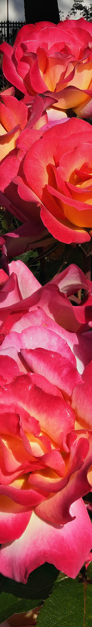 From a horizontal lens position at SJMRG plot 60, several Rainbow Sorbet cultivar roses including garden background.