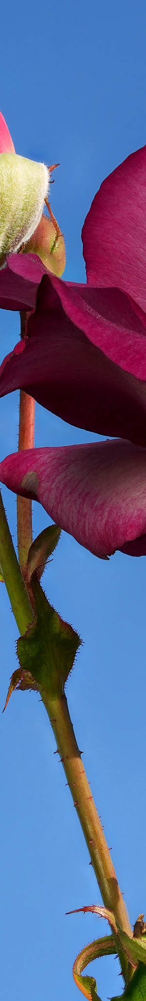 Worked on Thursday May 2, 2024. Looking up into blue sky at SJMRG plot 117, a Melody Parfumee cultivar rose.