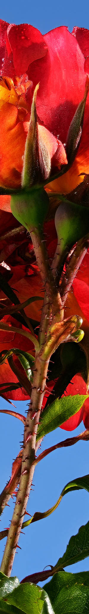 Large cluster of back lit wet vibrant, top lit Fired Up cultivar roses in the blue sky at SJMRG plot 106.