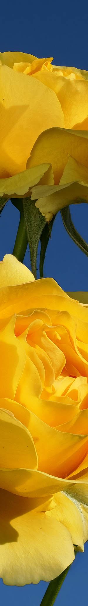 Worked on Monday May 6, 2024. Group of 4 yellow Autumn Gold cultivar rose blooms up in blue sky at SJMRG plot 15.