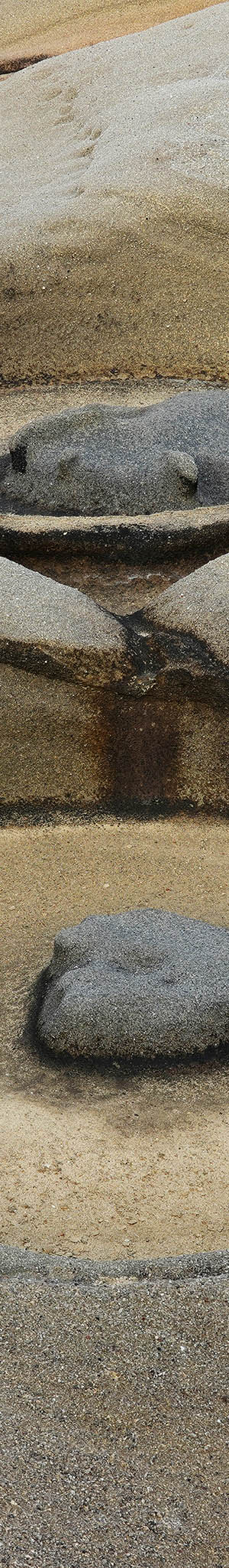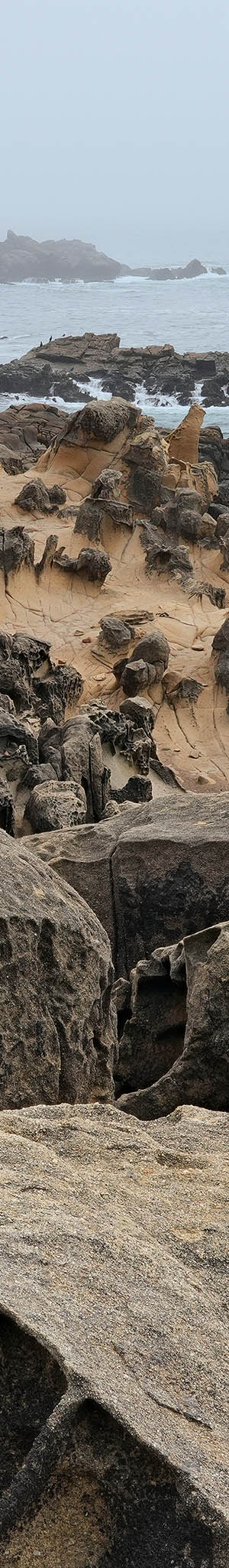 Out on this headland point, an unusual sandstone shore erosion formation of beige hued, round tubs with central blue-gray pedestals. The geology appears similar to an area at Point Lobos on its mid southern shore. Water has further eroded small seawater grooves with dark organic coatings since large waves crash about the area.