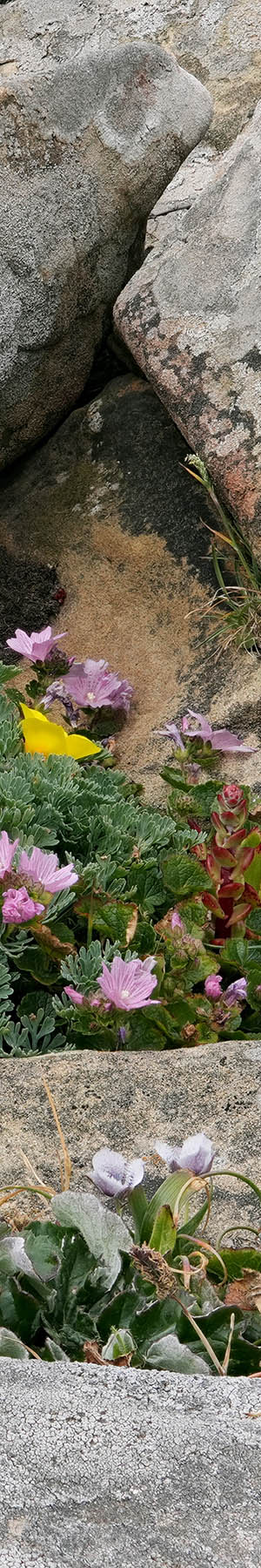 At 11:09am, a lichen covered sandstone outcrop rock garden with sea lettuce, checker mallow, California poppy, and pussy ears, calochortus tolmiei, also called hairy star tulip.