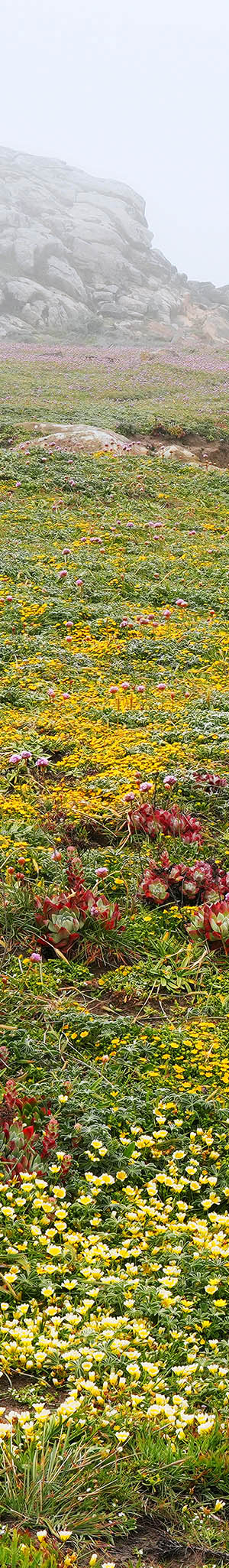 At 1:11pm in mid day fog light, seascape with coastal tidytips, layia platyglossa, California buttercup, ranunculus californicus, California goldfields, sea thrift, sea lettuce with the Pacific Ocean visible at frame mid right edge. Mid day has the best diffuse illumination filtered sunlight during fog.