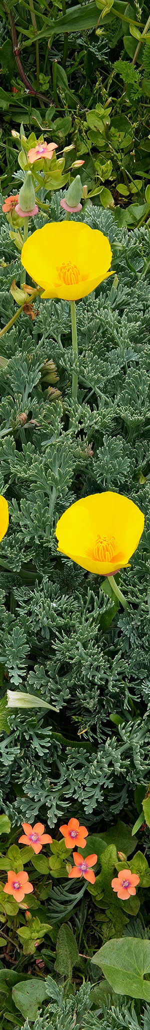 At 12:58pm, California poppy, with scarlet pimpernel, yellow bush lupine.