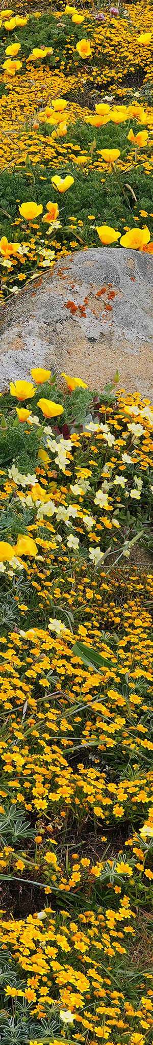 At 1:25pm, At 1:32pm, amid a sandstone boulder with lichen on lumpy ground, California goldfields, California poppy, creamcups, sea lettuce, sea thrift, and varicolor lupine without blooms.