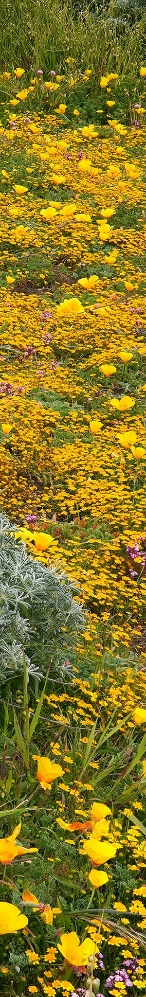 At 1:32pm, At 1:32pm, California goldfields, a yellow bush lupine plant, California poppy, rose johnny-tuck.