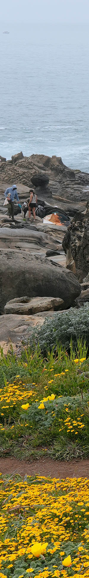 At 2:21pm at page top shows a foggy seascape with the use trail with California goldfields, California poppy, and sea thrift. A couple with their dog that were fishing is at frame left. I call this sandstone formation with tafoni, The Rockfish, given its shape, and gnarly surface.