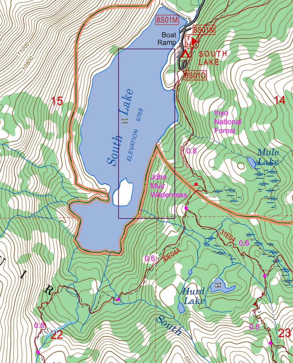 2024 Trip Chronicles: ContentsAfter spending Tuesday night along the road near the Sabrina campground, rose at sunrise Wednesday August 7, 2024, then drove back down to take the South Lake Road. I stopped at a convenient pullout where I poured all my gear onto blue plastic tarps then packed up my backpack and camera daypacks. I continued up the road to the 8am opened Parcher's Camp store where I bought a $3 pint of milk. Then continued the 1.3 miles to the South Lake parking lot trailhead at 9800 feet. The overnight slots were initially full, however within an hour, I replaced someone's leaving vehicle just returning from a backpack. Until mid afternoon would leisurely spend several hours at the parking lot. Skies were mostly sunny with mid day 70F temperatures forecast. While under a shading pine, was able to re-read about 60 pages of Ray Kurzweil's "How to Create Mind". Custom Caltopo map of the South Lake zone with that orange line the John Muir Wilderness boundary.