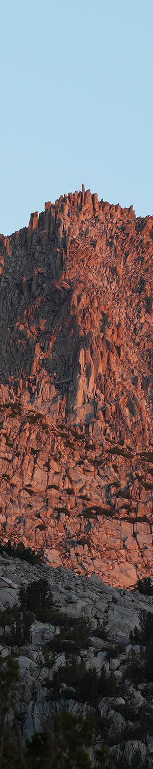 Sunrise Friday August 9, 2024 got outside my tent early to capture an erete section of Thompson Ridge in a sunrise orange light. I decided not to move my camp to Long Lake this day so would have a full day and second night here. After a warm hot chocolate for breakfast, climbed up to the 10920+ bedrock rib due east of the lake hoping to capture both lakes #2 and #1 in the same image however whitebark pines blocked most of lake #1 and lake #2 remained shadowed till about 8:30am.