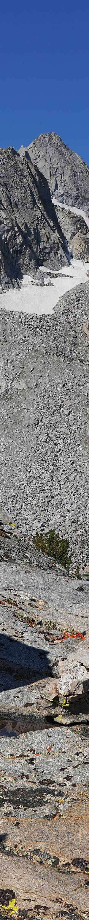 This next subject above shot at 9:25am, shows some lichen on bedrock beside a rain water pool with a bit of lake #1 below. After storms for a day or two, one may find numbers of such small pools in glaciated granite bedrock that can provided clean drinking water. The striking peak behind lake #1 with small permanent snowfields is noname peak 12040+. Given breezy conditions and limited exploration of the basin over 2 days, I wasn't too successful capturing this Treasure Lake zone despite plenty of aesthetic landscapes.