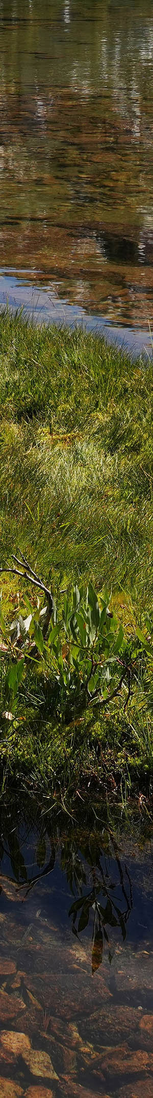 Back down at the lakes, breezes had not subsided all morning. I ventured over to the mossy turf lake #2 inlet and worked the above small mossy island in shallow waters with Sierra willow, ranger buttons, and gone to seed shooting star. The white reflections are clouds.