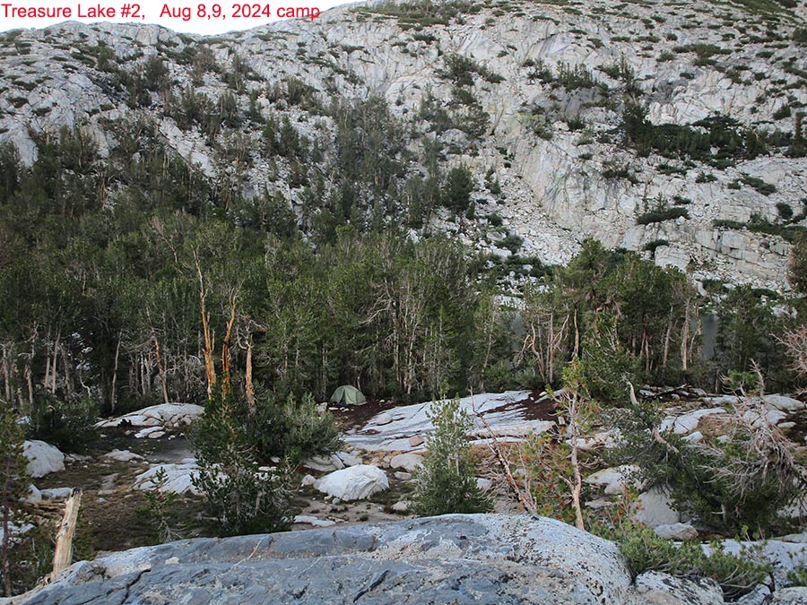 The above image after 3 hours of sometimes heavy rain, is a Canon ELPH190 view of my tent tucked against trees with Treasure Lake #2 beyond pines. Thunderstorms with at times strong rain with small hail began about 1pm and lasted nonstop for 3+ hours. Afterwards, explored much of the area. The best source of fresh clean water was along the south side of lake #1. The clean water from lakes #3 and #4 stream was blocked by areas of large talus and dense tall willow. Lake #2 is rather algae coated with an abundance of pan sized rainbow trout and golden rainbow hybrids. Largest fish I saw was maybe 11 inches and felt I could have easily caught fish had I tried. D