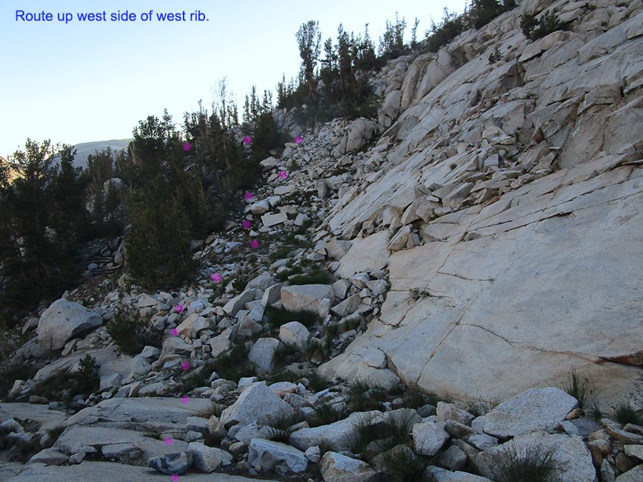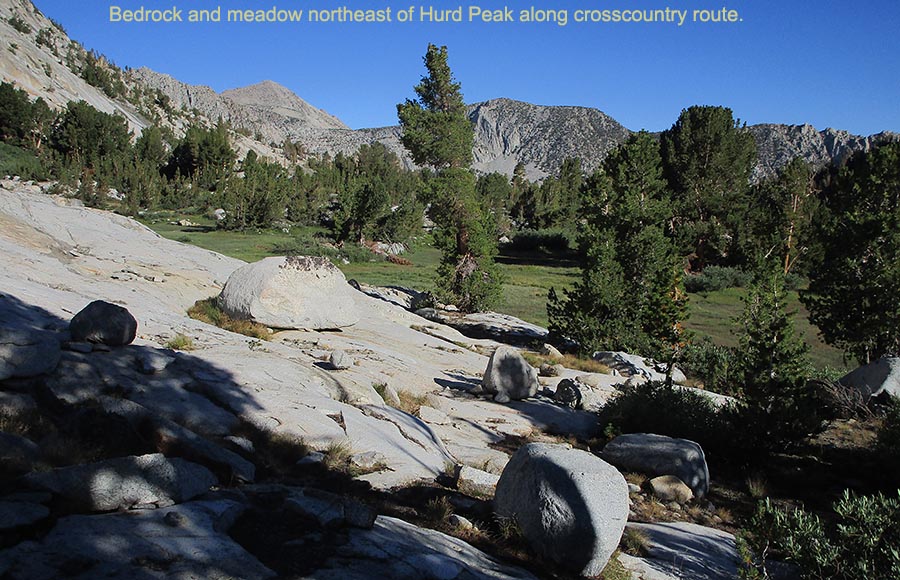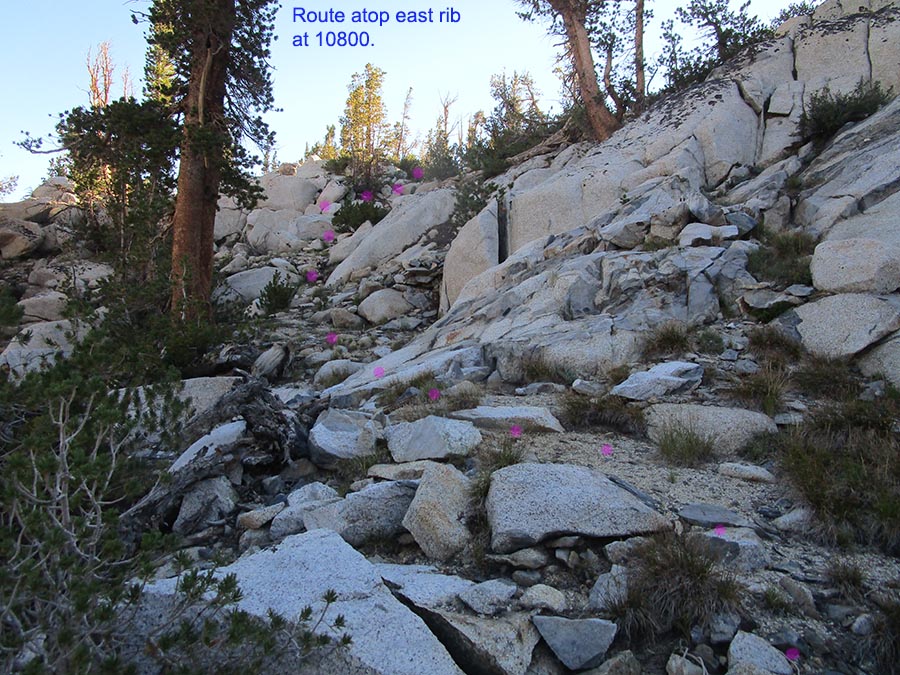 At page top is a view from that rib towards peak 12792 at frame center, all granitoid geology. Parts of both Treasure Lakes #1 and #2 are below.