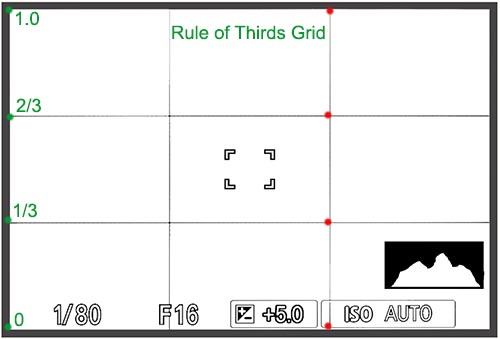 For manually stitch blending frames, there should be at least an approximate 1/3 overlap between frames. Thus, I use the Rule of Thirds Grid display mode. One should set up the first image in a set horizontally balanced using the Electronic Level so green replaces any orange tilt. For a second frame, any one of the green dots at frame edges I added to the display image, need to be moved to corresponding red dots on same grid lines while also balancing the horizontal level for that same red dot point. The vertical level can be ignored as long as one of the red dots on grid lines is used. That will result in a 1/3 overlap. From the 4 green dot positions, I choose one that has some subject element I can easily recall the exact position of once moving a head position. Losing the exact position, may result in having repeat shooting all frames again.
