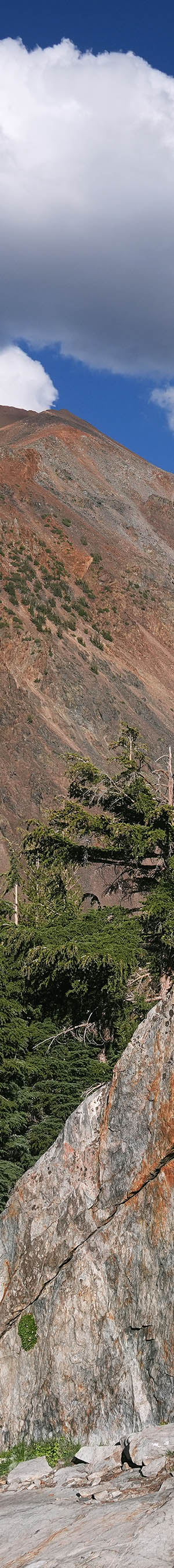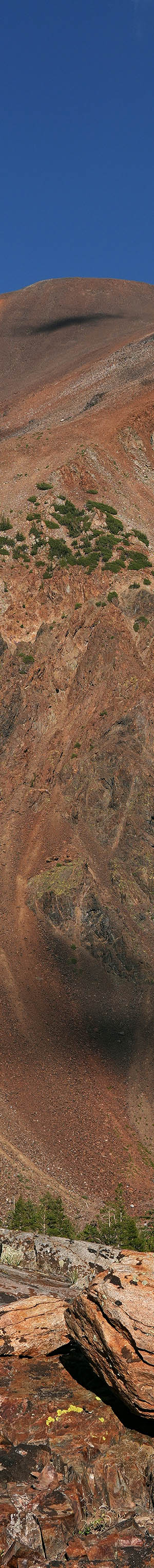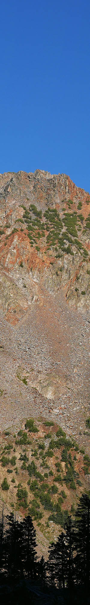 By 5:30pm I had located the best nearby location without blocking pines to shoot rusty red metamorphic sedimentary 12374 foot Dunderberg Peak, the main subject for late afternoons. There, I worked the above single frame landscape requiring 9 focus bracket shots. The peak has the same geology as the East Lake area while the colorful peaks and canyon further west are extrusive igneous rock.