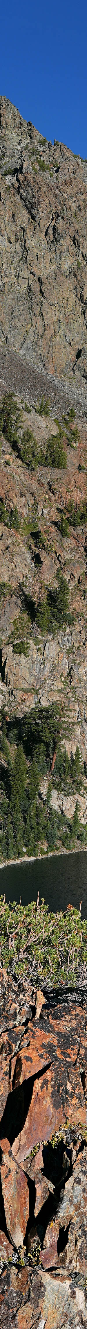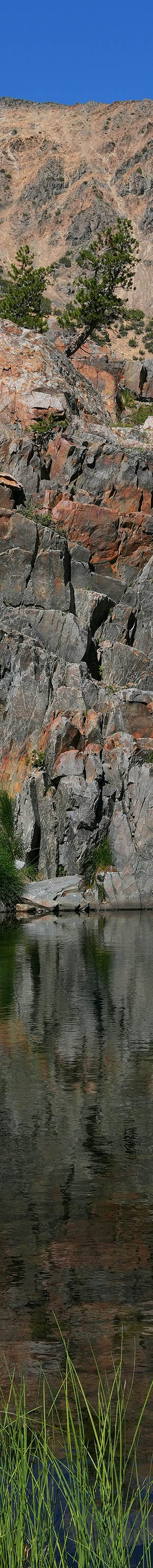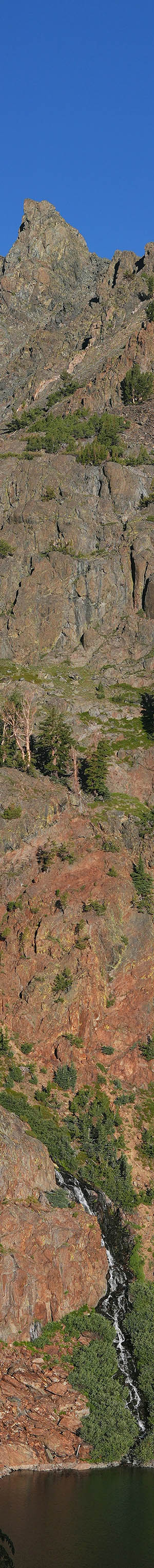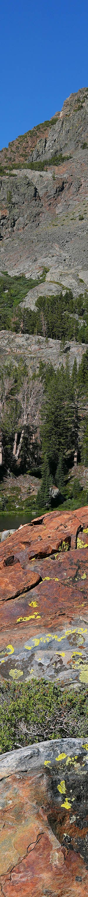 At 8:20am, I reached the trail overlook point at the southeast end of East Lake then set up the above 4 column 2 row 8 frame stitch image requiring 58 shots. Notice how an hour later, rock has less warm coloration versus UQ04522-04540-4x1vb. Epidote Peak is at left and Page Peaks at right. Between them is the light orange hued ridge leading to out of view Camiaca peak. Another East Lake subject that would be best on an uncommon calm morning.