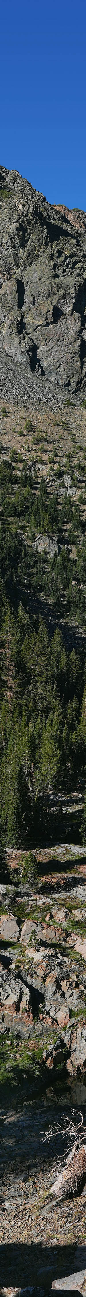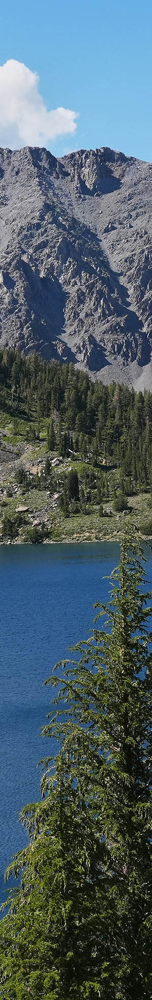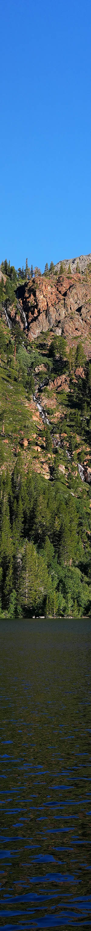We left our tents after sunrise Friday July 26, 2024 after sunshine moved down Page Peaks and Gabbro Peak. Thus I had plenty of time to set up my camera before at 7:14am working this first subject of the day above, a 30mm lens 11,300 by 6100 pixel 4 column stitch blend. I included little of the East Lake waters because of shadows lower left. One will note the still warm light on the rock. The deep greenish brown lake water itself reflects that same geology. Only in the afternoon when shooting northward does one capture blue waters. The cliff band along the west lake shore prevents any circumnavigation around the lake. Ideally aesthetically, would be an uncommon calm morning offering far shore landscape reflections.