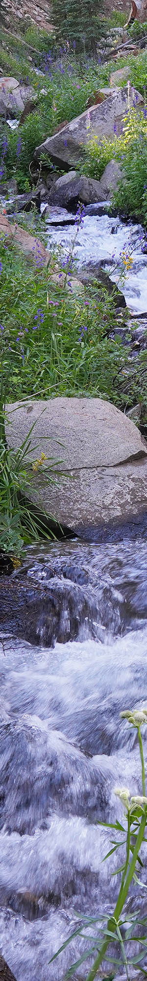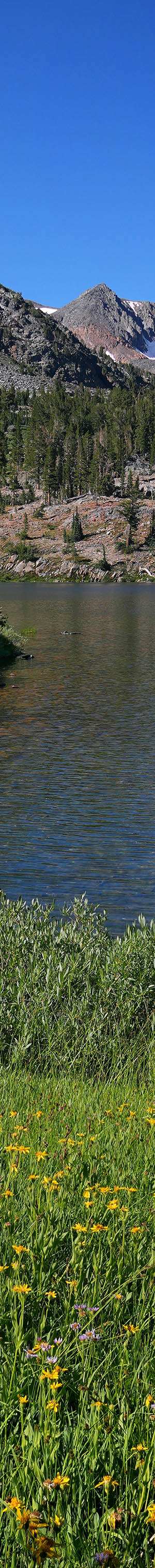 At page top is my strongest image of the trip worked at 9:10am from the east Gilman Lake bay where a dense patch of soft arnica, arnica mollis, provided a superb foreground. Mixed in were a few blooming western aster, aster ascendens, and swamp onion, alium validum. Fronting the lake shore are the ubiquetous Sierra willow, salix orestera, with mountain hemlock, lodgepole pine, whitebark pine, along the shores. I also worked a flowery stream area, however the still strong breezes made the result difficult to process due to misregistration between focus bracket shots.